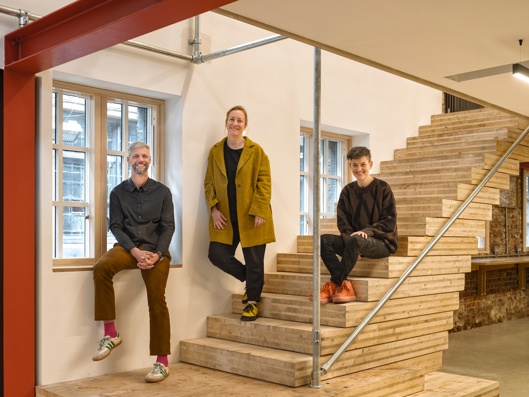 dRMM Directors Jonas Lencer, Saskia Lencer and Judith Stichtenoth photographed on the staircase in their recently retrofitted London studio, that is made from CLT leftover from a client.