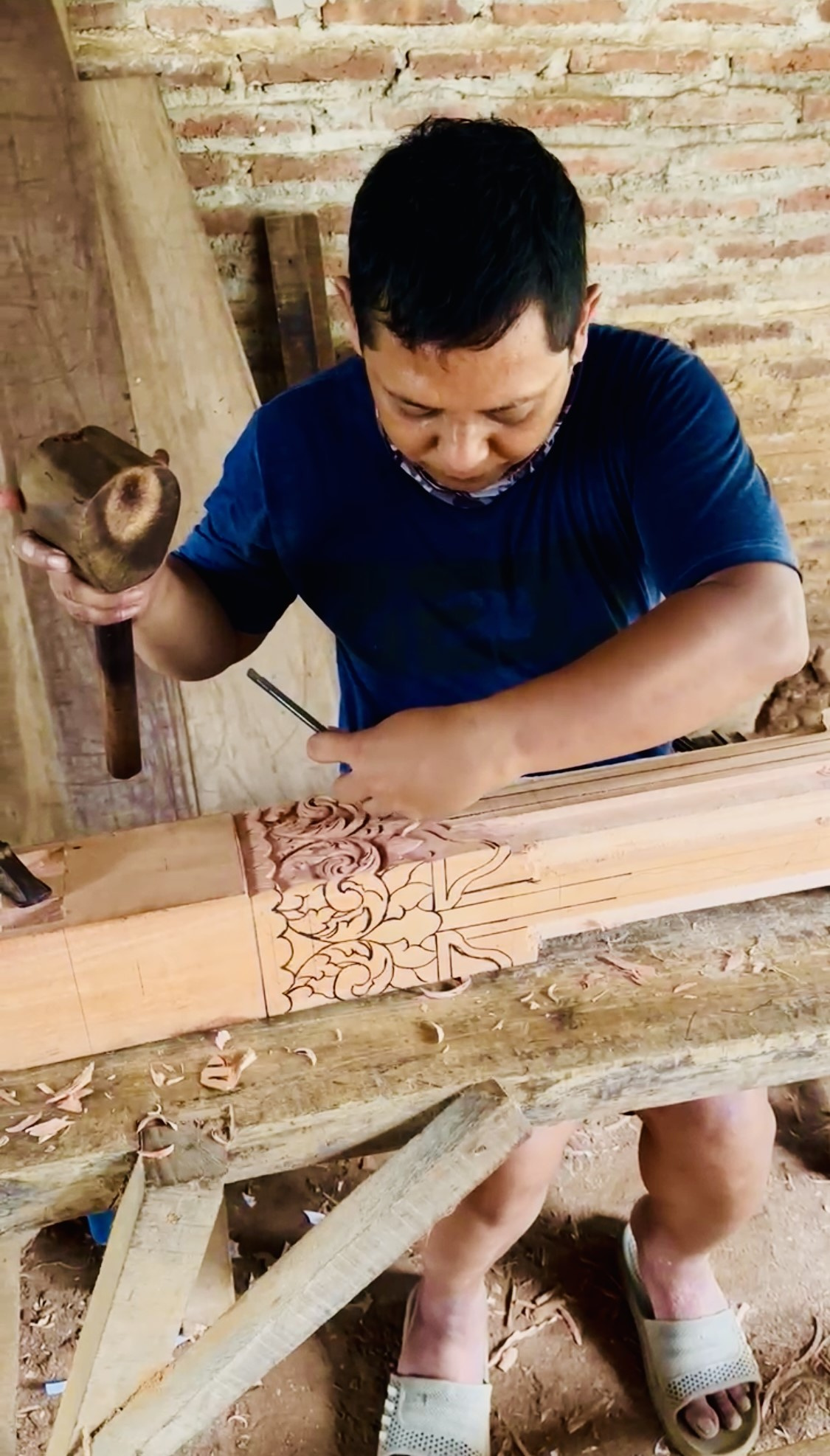 An Indonesian artisan carves an intricate column from sustainable mahogany. LOKI works with small restoration and reforestation groups in areas impacted by illegal deforestation. For every project it builds, the company replaces its timber consumption by planting 150 per cent more trees than it uses.