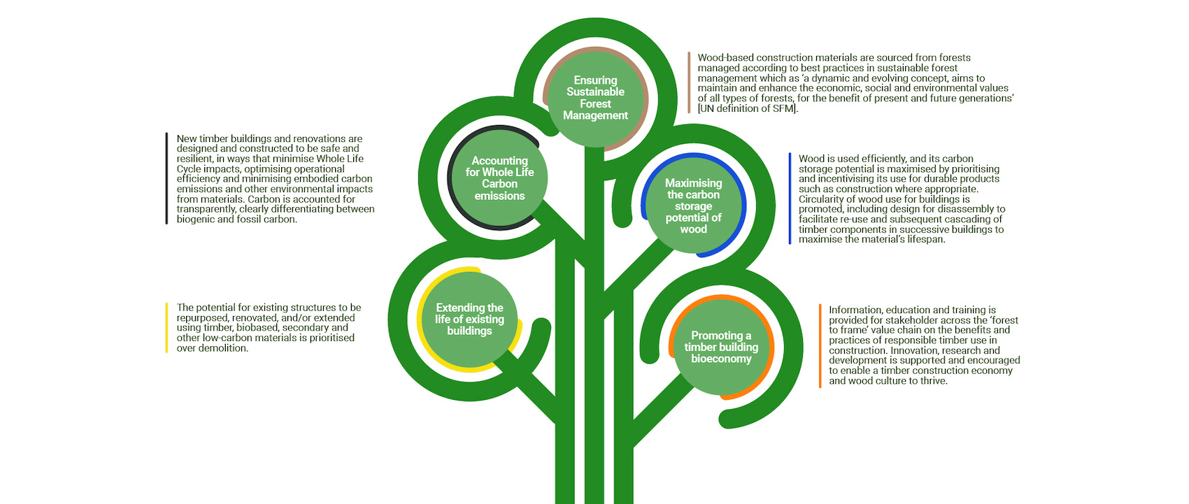 A transition to biobased construction can help deliver low-carbon cities aligned with international climate commitments. The Measuring Mass Timber report evidences reductions in embodied and operational emissions, alongside improvements to wellbeing in timber buildings. Substituting high-carbon and extractive materials for renewable alternatives saves and stores the carbon locked-in from the atmosphere as the material grows. Accurate and transparent accounting for the Whole Life Cycle carbon impact of buildings, clearly differentiating between biogenic and fossil carbon, is necessary to the Principles’ aim of developing a ‘common language’.