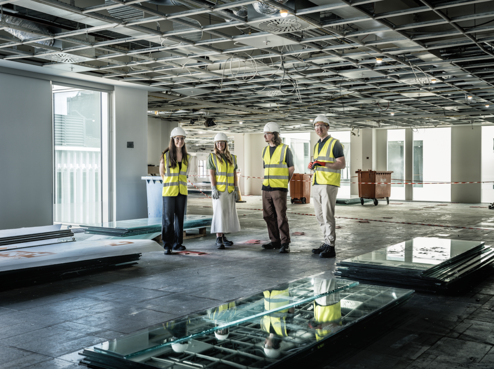 Rachel Hoolahan (left) with colleagues Sacha Clark, Rufus Burridge and Simon Whittaker at 1 Hanover Street in Mayfair, London, a Grade II-listed office building which Orms is refurbishing and extending for The Crown Estate. Orms is returning the original ceiling tiles back to SAS, who will refurbish and resell them through a programme it has developed with Orms’ support.