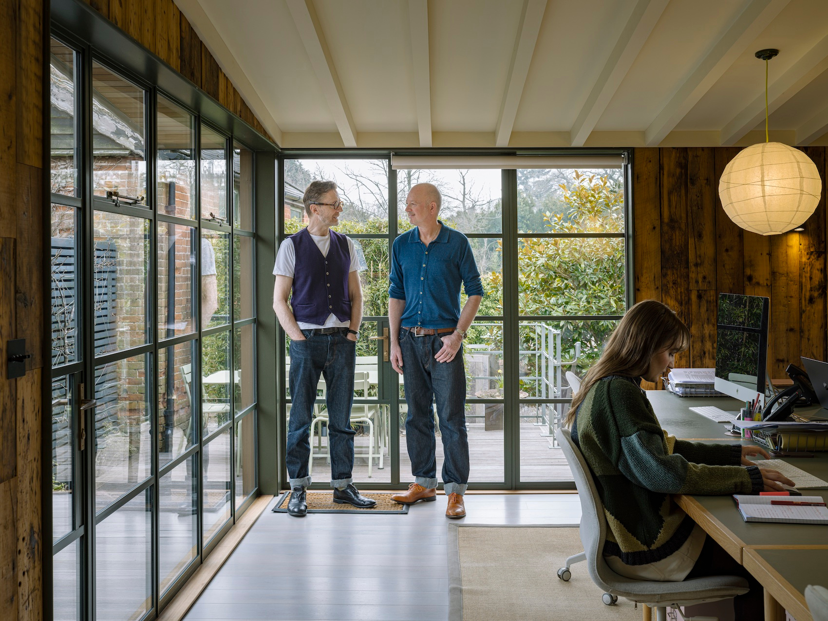 Project Orange founders Christopher Ash and James Soane photographed at their new studio in Lavenham, Suffolk. “It’s the ideal place to work from as it has a garden and a view of Tudor roof tops. It was originally an artist’s studio which was retained and added to. The interior is clad in old pine planks which lends a mellow ambience.”