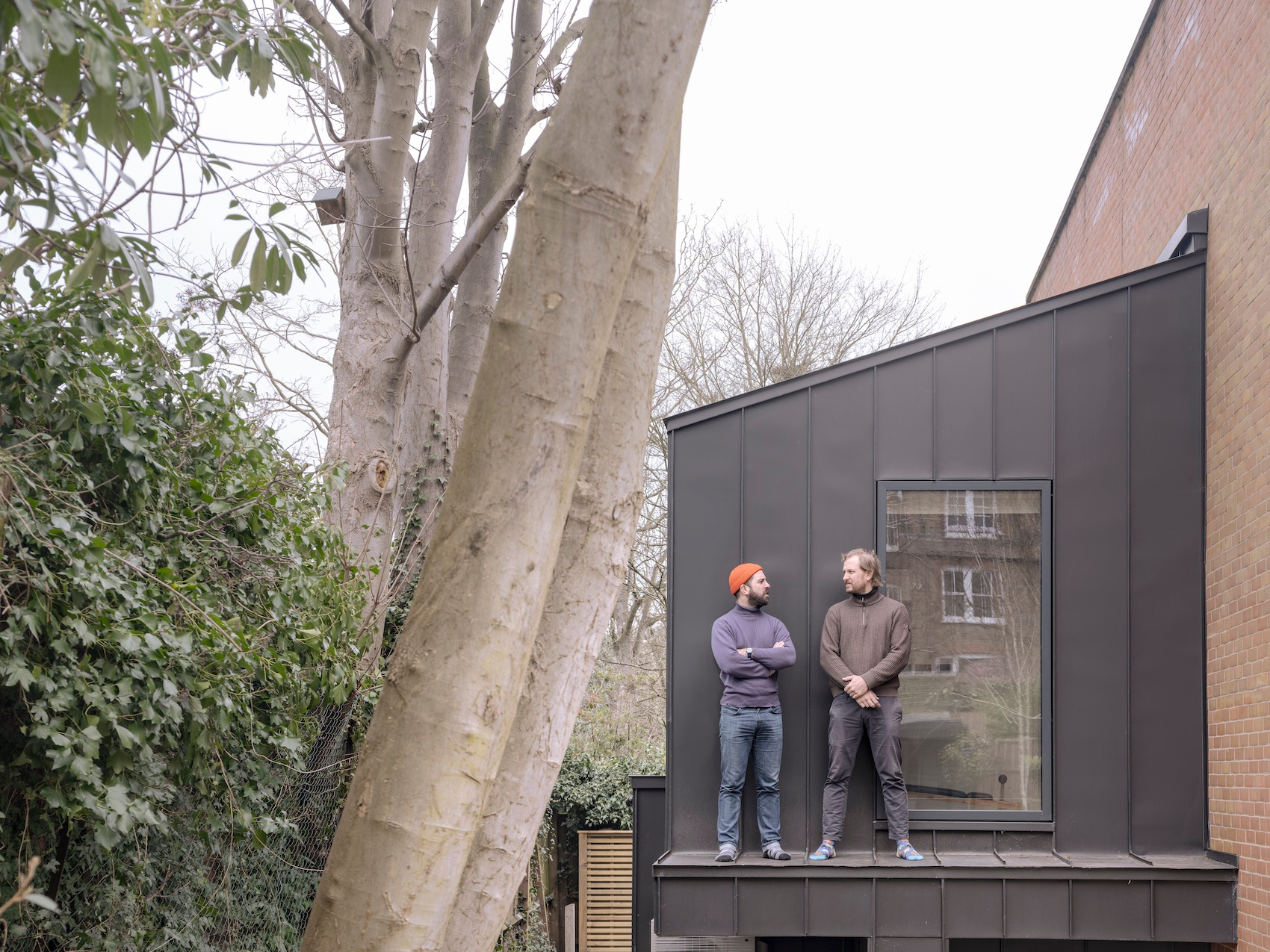 8FOLD founders Aleksandar Stojakovic and Alexander Frehse photographed at Parham Way, and end-of-terrace extension in North London that features an air source heat pump, solar panels, a battery heat and power system, triple glazing and Leti-standard insulation.